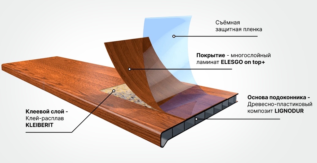 Ещё одна инновационная технология, используемая при производстве подоконников Moeller, — ламинированное покрытие Elesgo Plus on Top, разработанное известной немецкой компанией DTS. Это покрытие состоит из нескольких слоёв тончайшей плёнки, основой которой служит меламиновая смола.