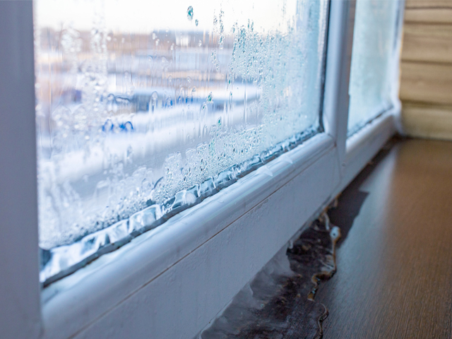 - Влага и «слёзы» по внутренней поверхности стекла, мокрый подоконник.